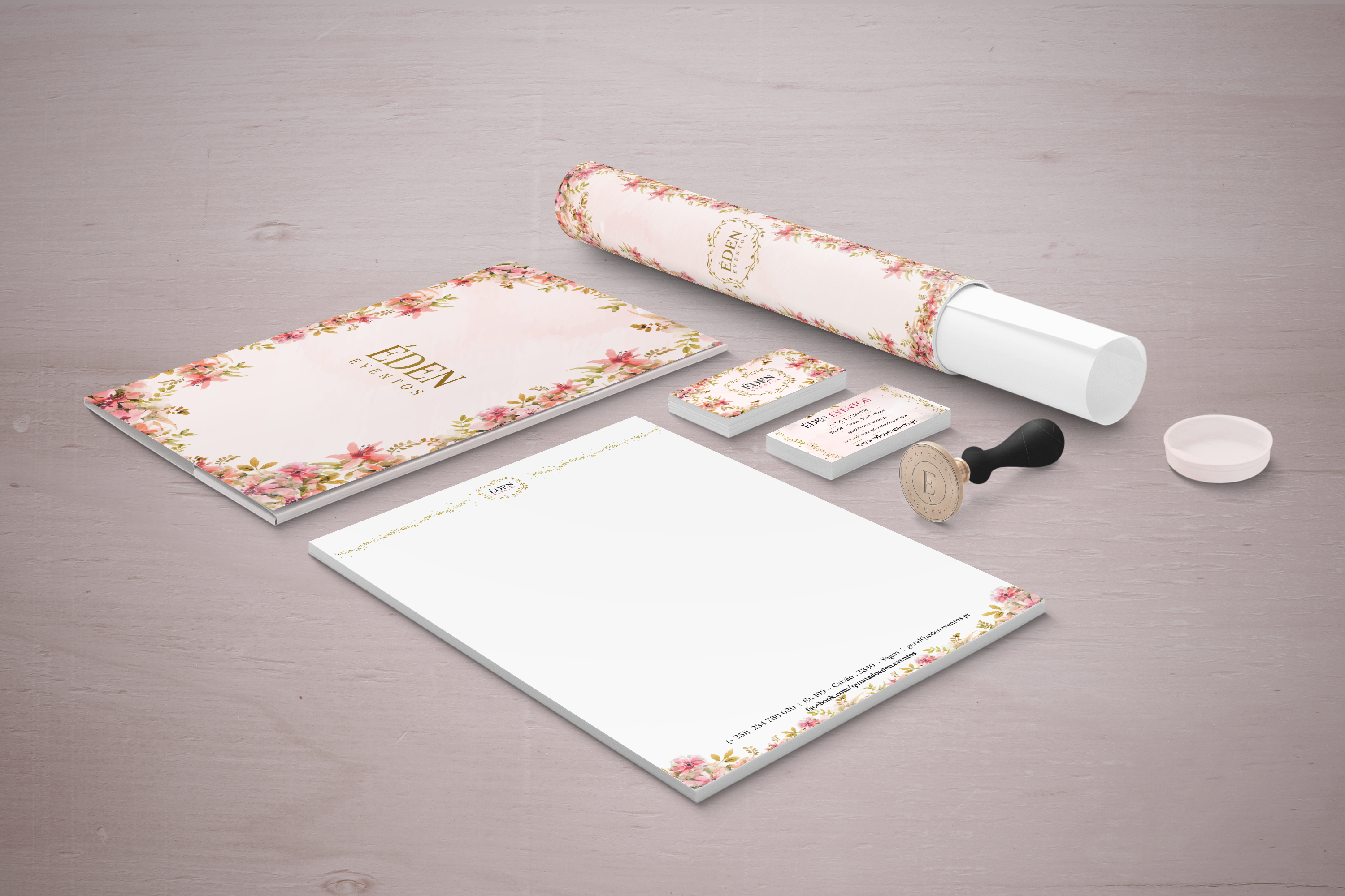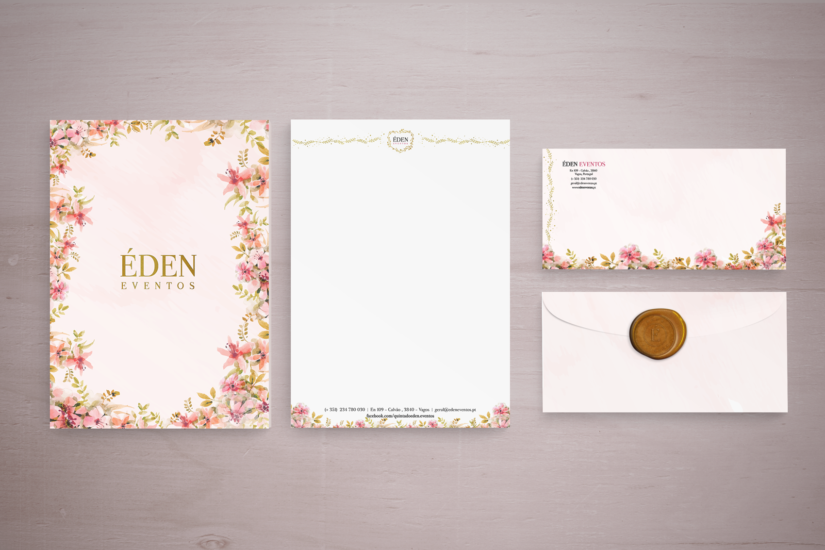 Objetivo do projeto: Rebranding de identidade visual da marca Éden Eventos e dos seus materiais de papelaria.