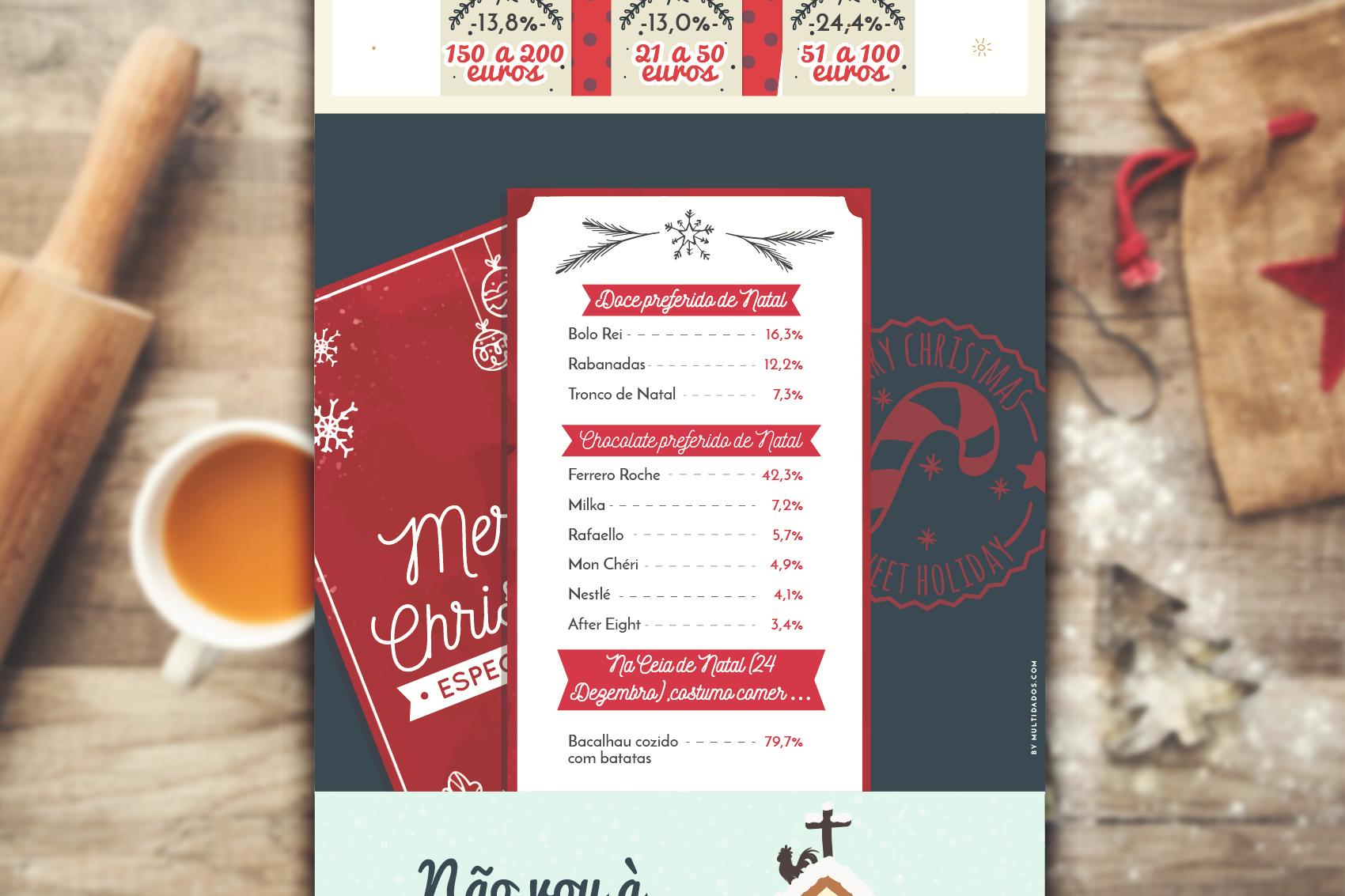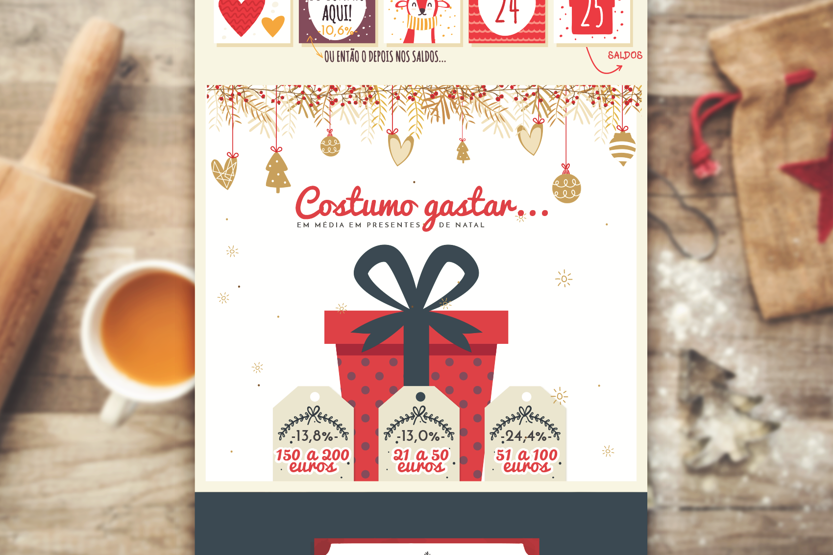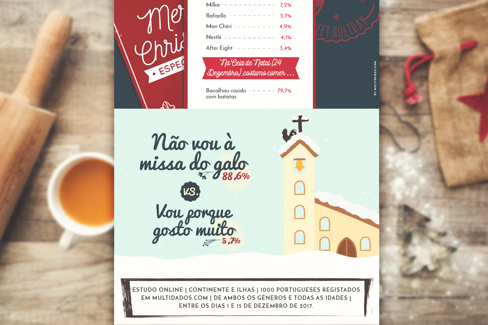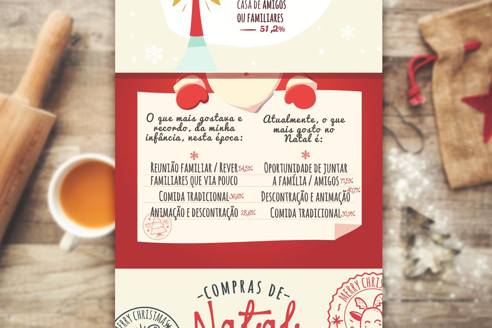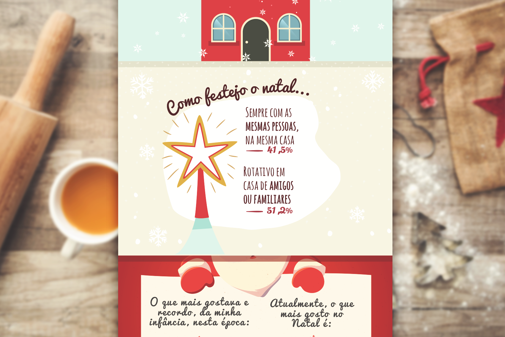 Para transmitir informação sobre os hábitos e comportamentos da população nesta época festiva, foi realizado um estudo de mercado que seria apresentado com recurso a infográficos. Tendo em conta que o volume da informação era extenso, esta foi estruturada por blocos, para que fossem aparentados em quadros como se estivesse a ser “contada uma história”.
