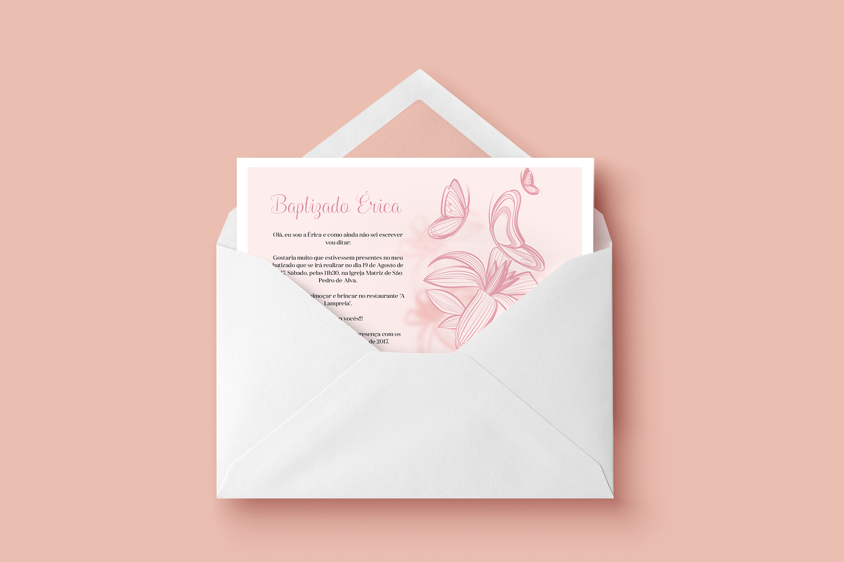 Foi pedido para incluir neste elemento desenhos ilustrativos de borboletas, bem como a cor rosa, utilizando um tom diferente dos ditos “normais” para meninas. Algo bastante simples e com um aspeto pouco infantil, mas remetendo para uma celebração infantil, foi algo também transmitido no briefing inicial.