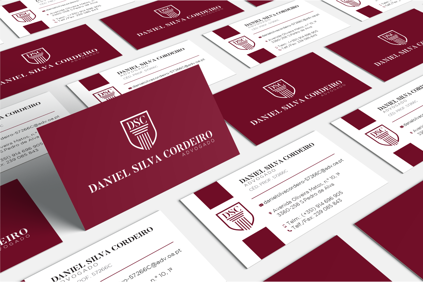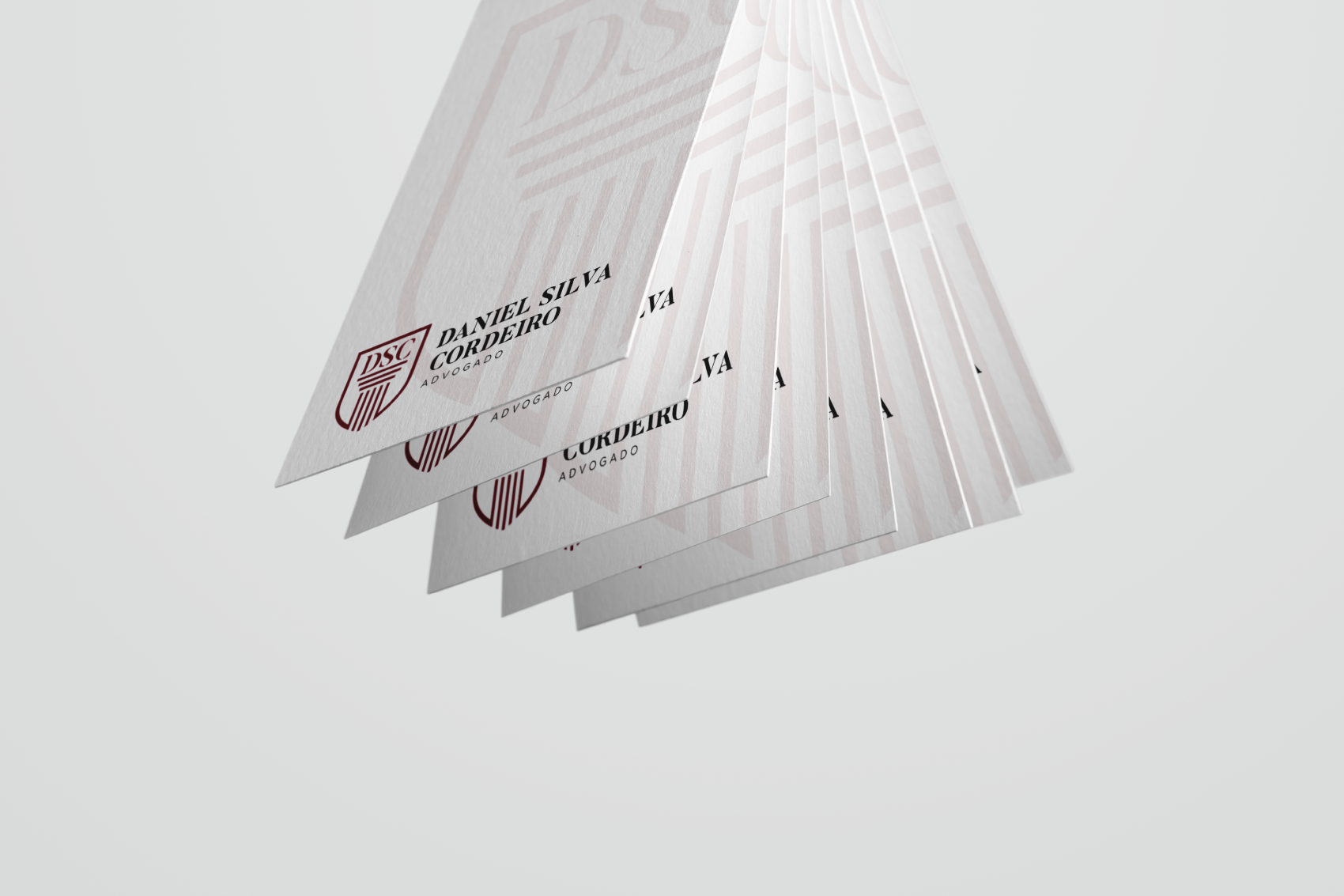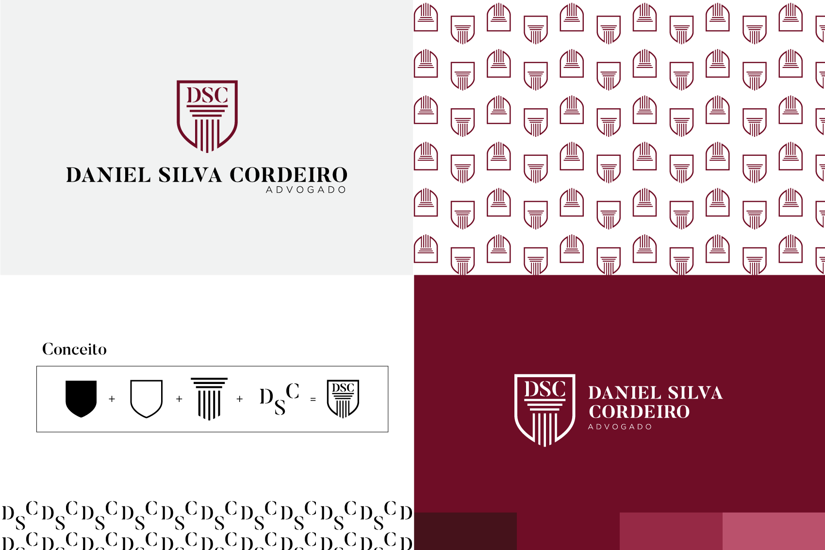Utilizar as inicias do cliente no logo (DSC – Daniel Silva Cordeiro), símbolos que remetessem para a advocacia, lei, justiça, algo formal tendo como cor principal uma tonalidade de vermelho, foram os requisitos principais na composição da marca.