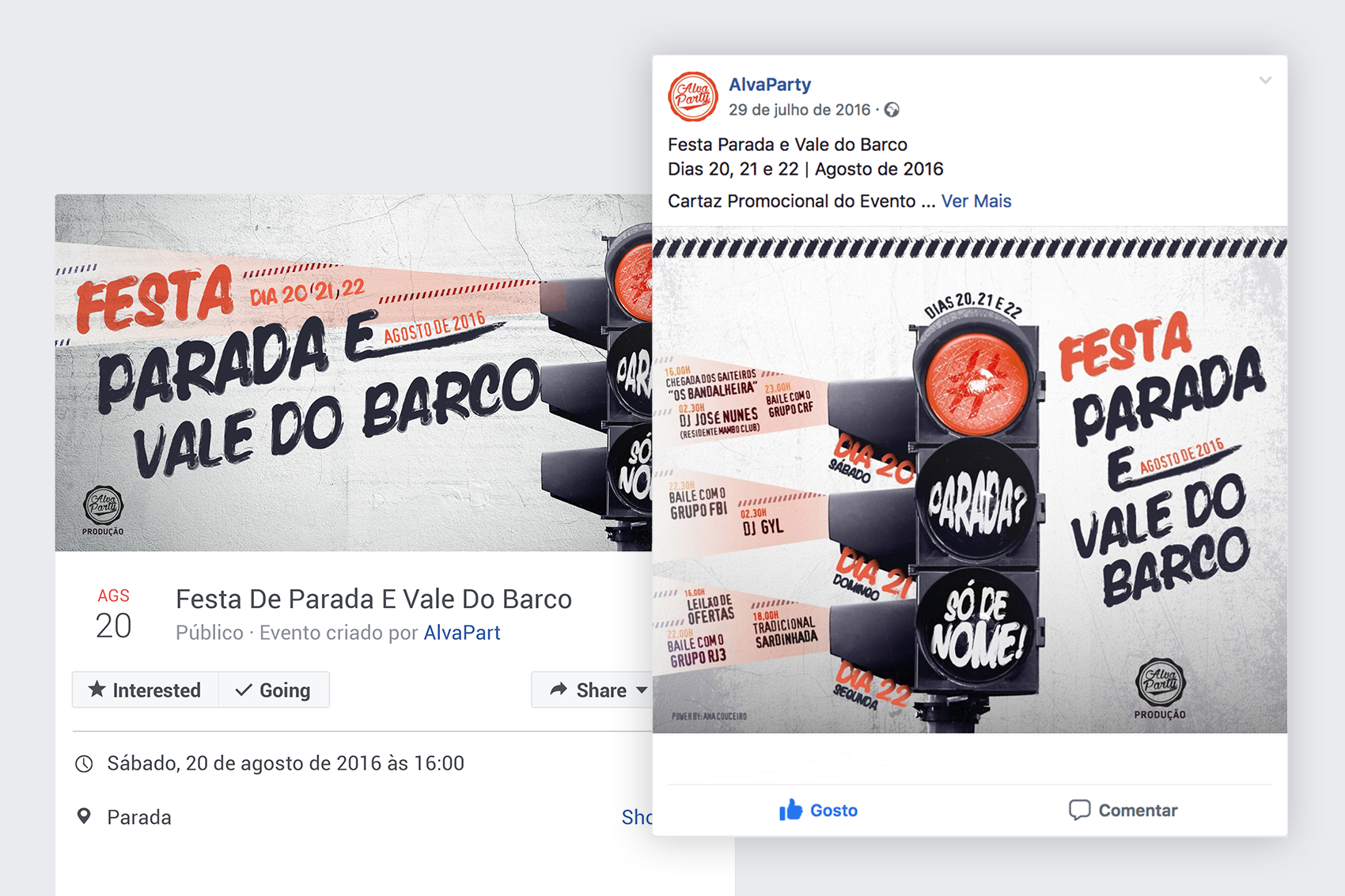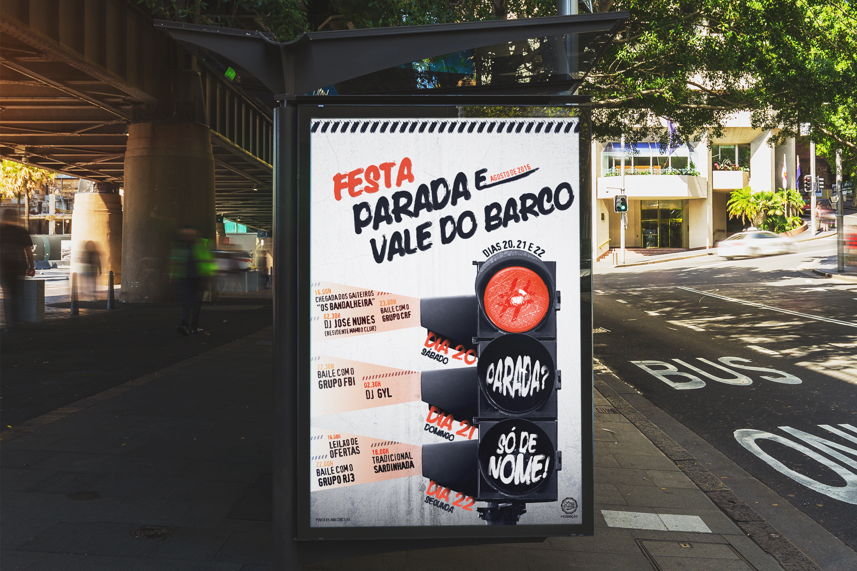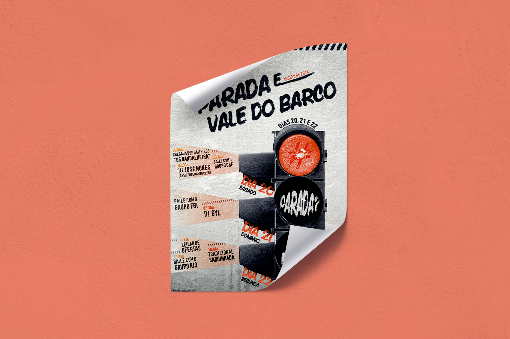 Foi solicitado a invenção de um slogan para a festa, bem como a presença de algo alusivo à localidade na ou à festa. Foi escolhido um semáforo vermelho, para fazer a ponte entre o slogan, as caraterísticas da festa e o seu nome. A cor vermelha presente no cartaz faz ligação ao elemento principal nele presente.