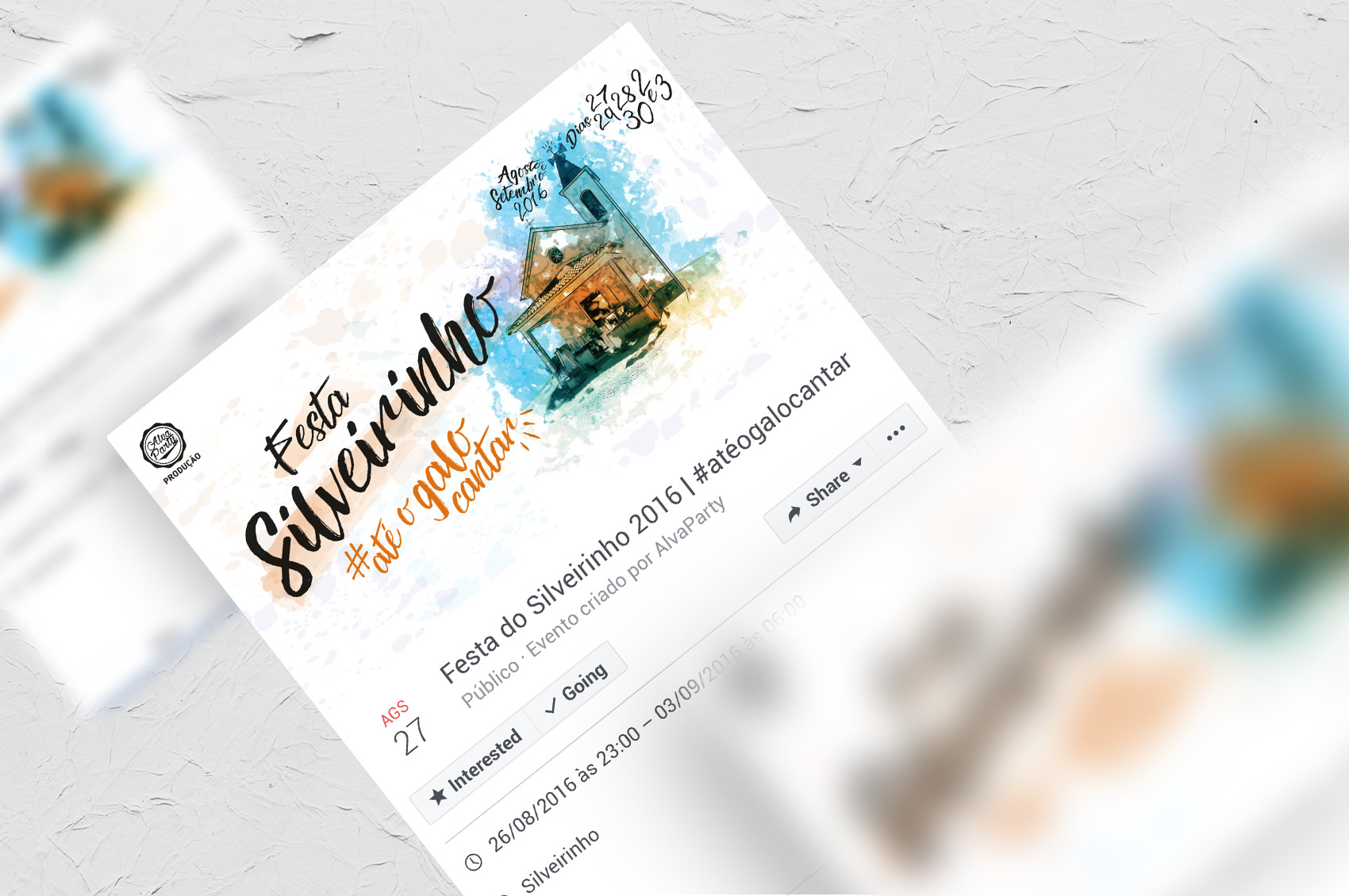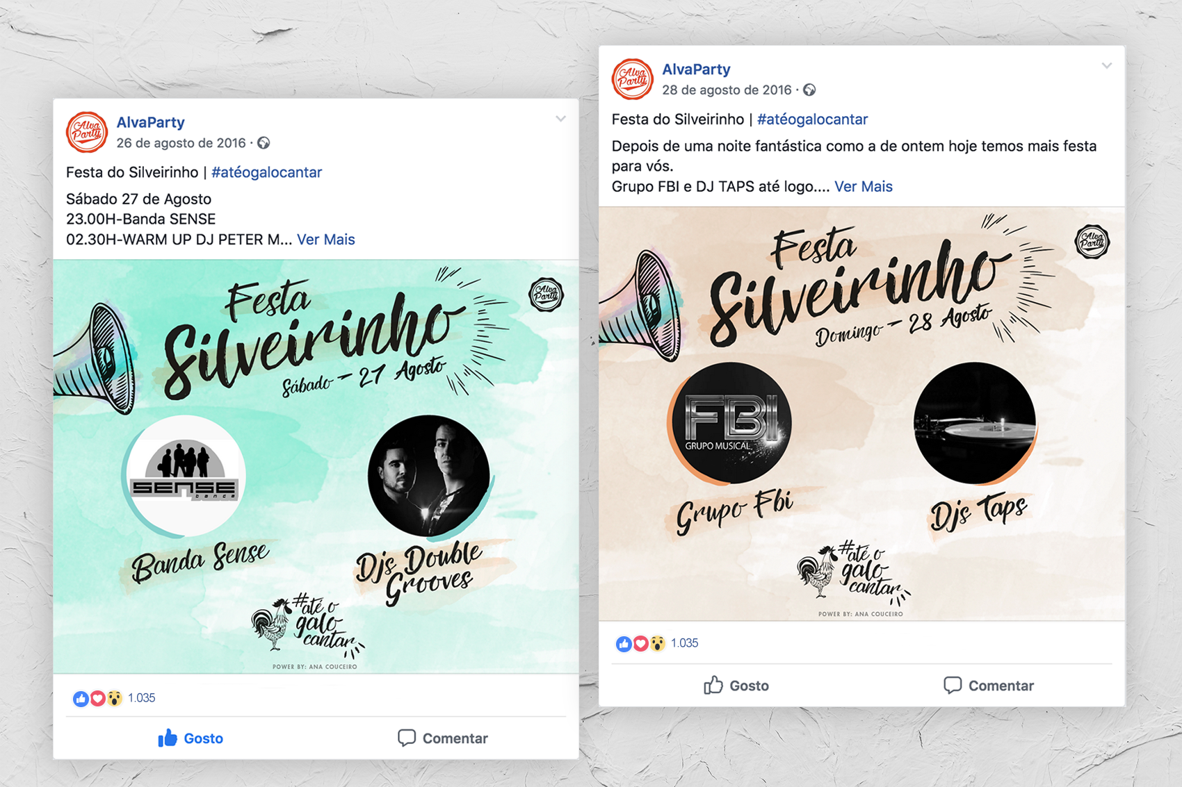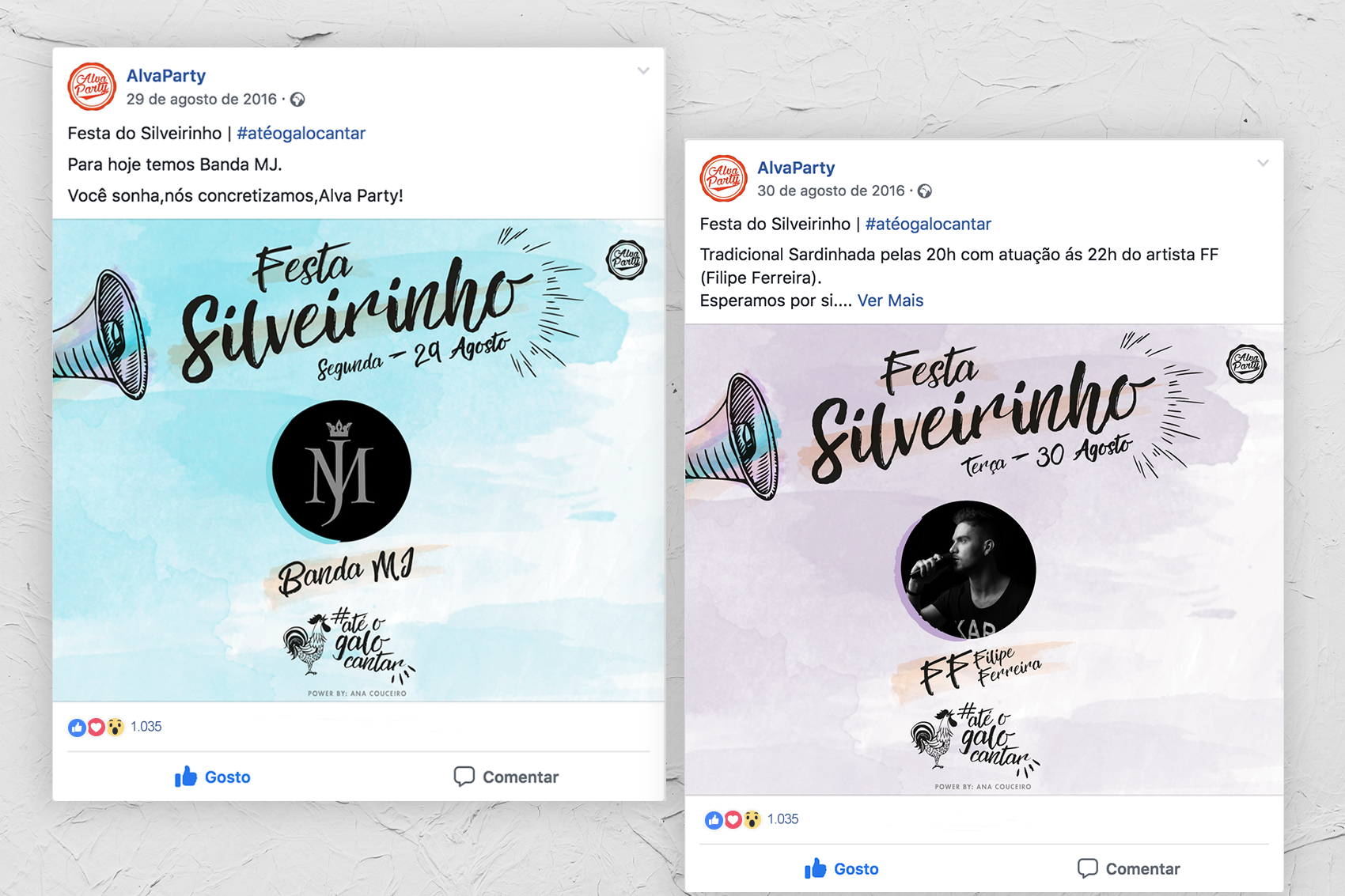 Foi criada um slogan para o evento, que se mantém até ao ano corrente, baseado e, características da região: o cantar de galos durante a madrugada nas imediações do recinto da festa, e no característico galo no topo do edifício mais antigo da localidade, a sua capela. Este passou então a ser o foco principal do cartaz, pois foi pedido que fosse incluído algo que tivesse ligação à localidade.